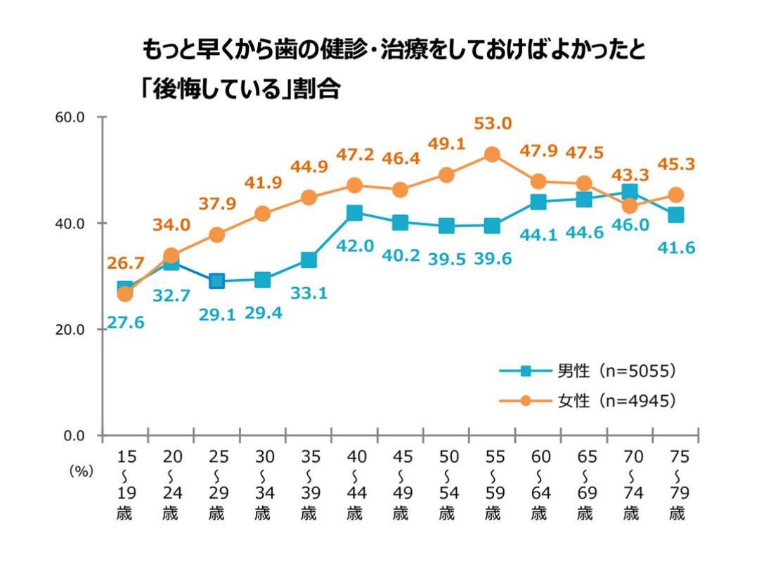 もっと早く歯医者に行っておけばよかった… 日本人の4人に3人が後悔 。もっと早くから歯の健診や治療をしておけばよかったと、全体の4人に3人(75.7%)が後悔。 後悔しているのは男性より女性に多く、女性は年齢とともに50代後半をピークに年々上昇。